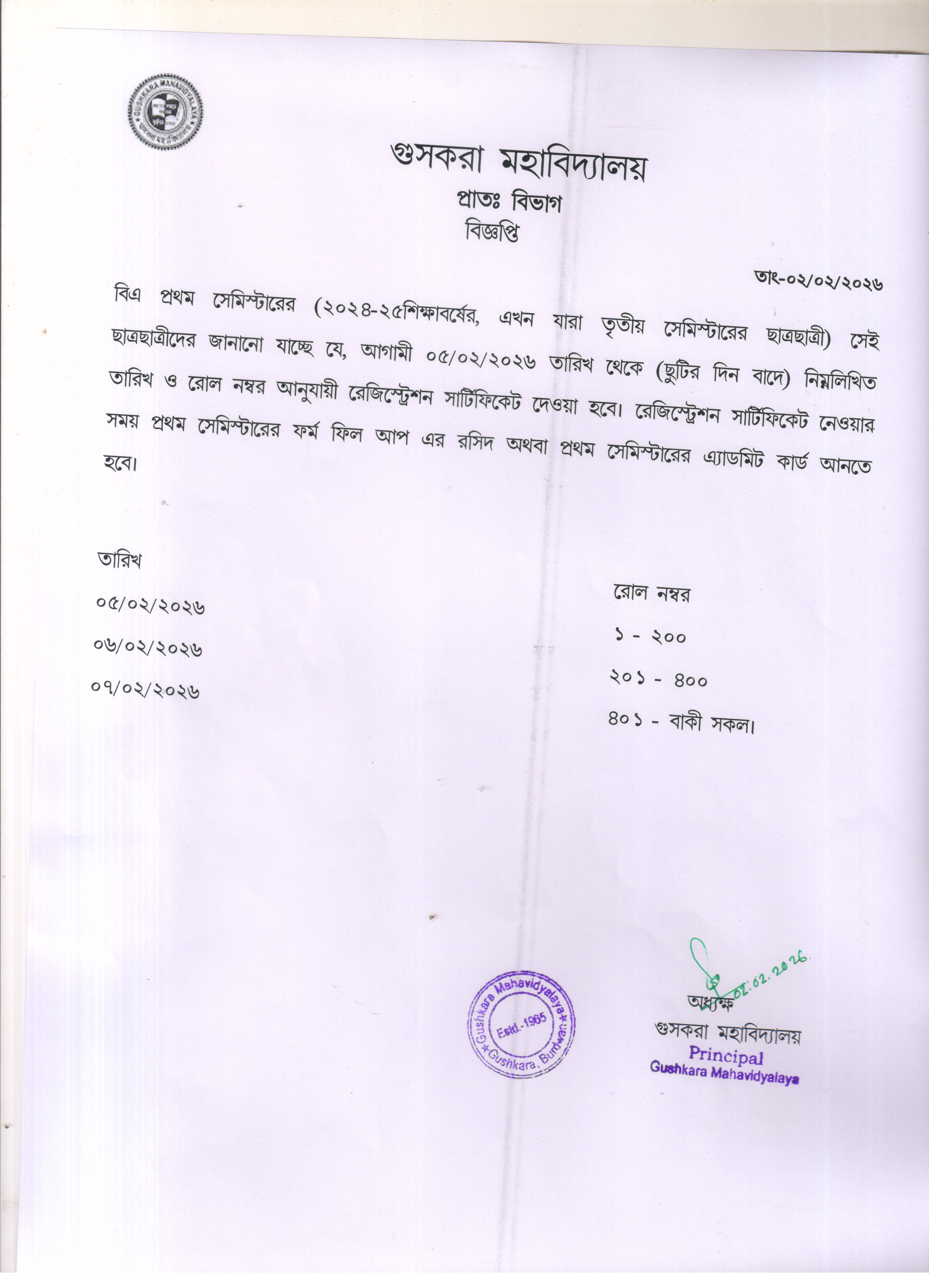 Notice for Registration Certificate Distribution Semester-1 2024-25 (Morning Section)