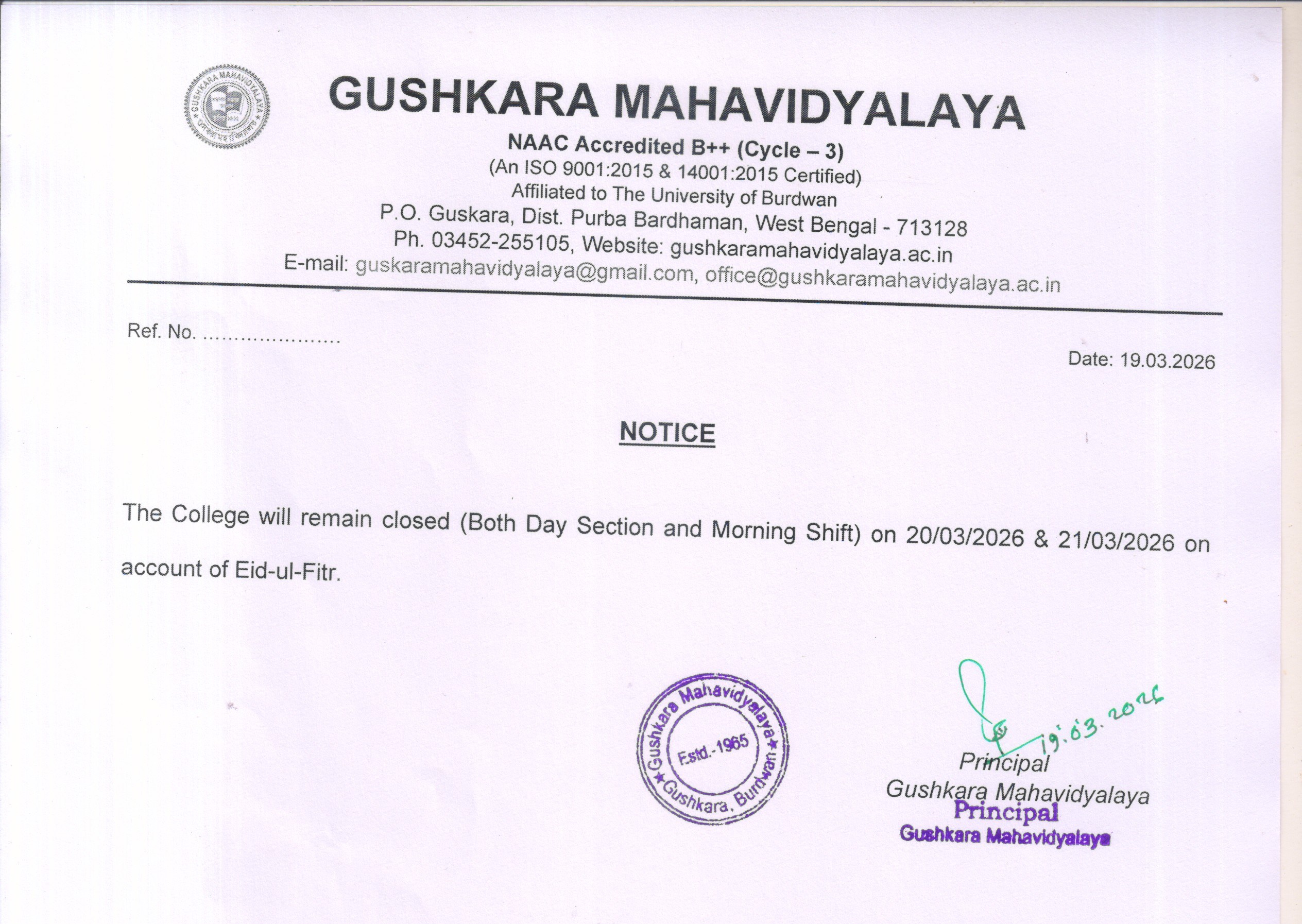 Read MoreIn consonant with the every noble task done under the sun, our college also cherishes a benevolent vision for its future programmes. The vision of Gushkara Mahavidyalaya is to emerge as one of the leading academic institutions in the region where knowledge and skill complement each other and competence leads to confidence among the students. We constantly strive ...
